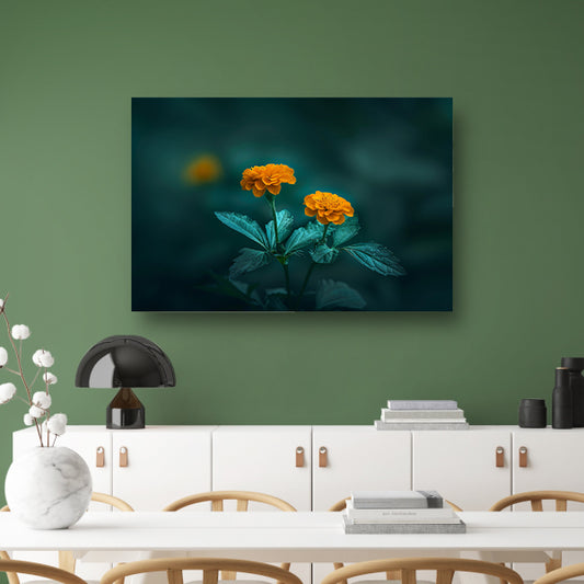 Twee oranje bloemen tegen groene achtergrond canvas