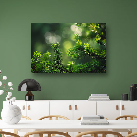 Groene naalden verlicht door zonnestralen canvas