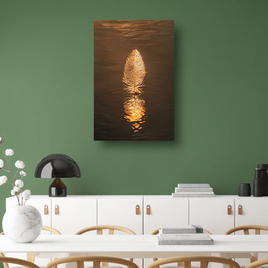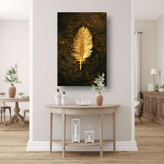 Gouden veer zwevend op donker water poster