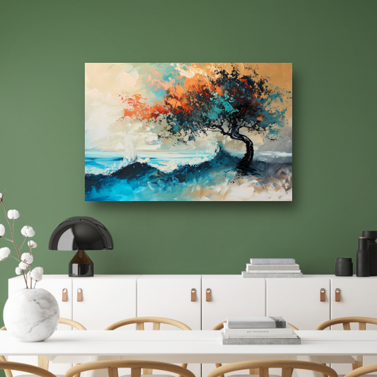 Expressieve Abstracte Boom aan Zee met Levendige Kleuren poster