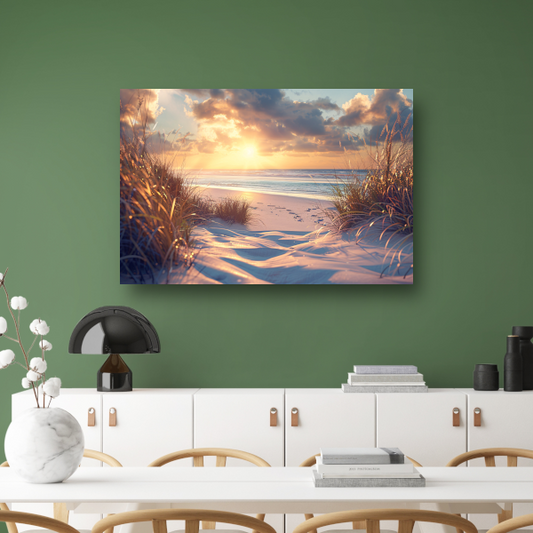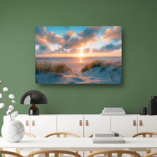 Betoverende zonsondergang op het strand met levendige kleuren poster