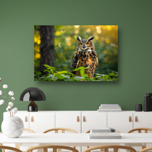 Wijze uil in het groene bos bij zonsondergang poster