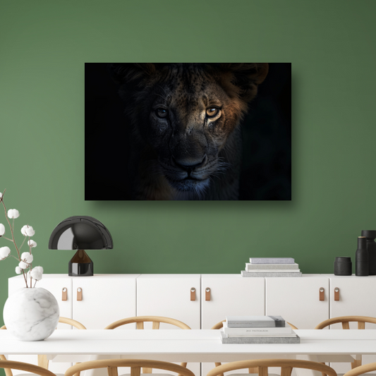 Indringende leeuwenblik in schemerige duisternis poster
