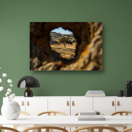 Prachtig uitzicht op vulkaan door rotsopening canvas