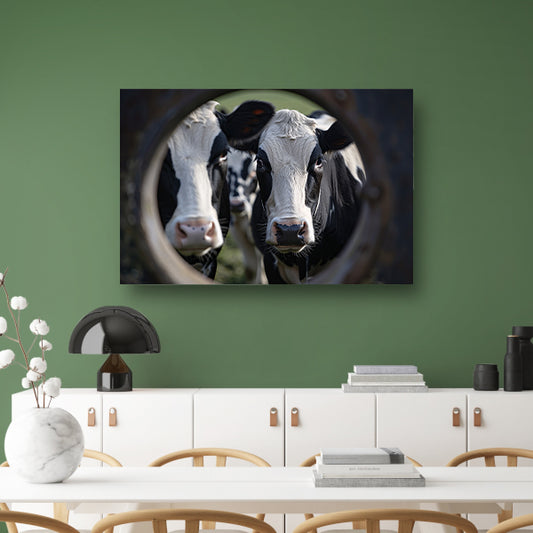 Nieuwsgierige koeien kijken door sleutelgat canvas
