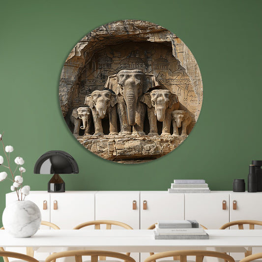 Groep olifanten in artistieke rotsholte aluminium muurcirkel
