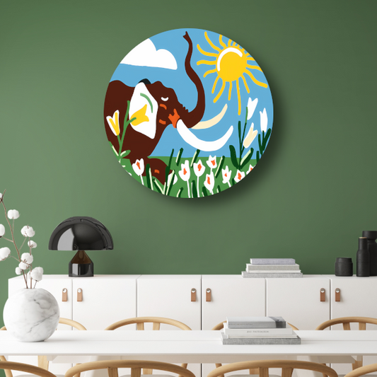 Vrolijke olifant onder een heldere zon aluminium muurcirkel