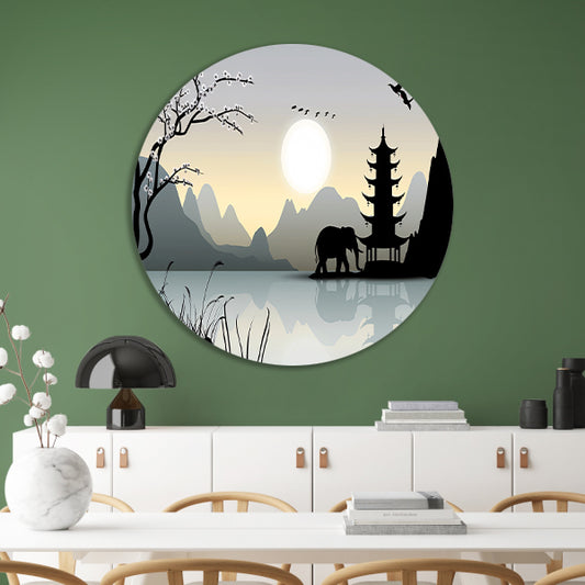 Silhouet Olifant bij Pagoda aluminium muurcirkel