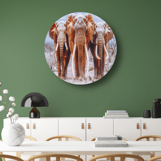 Olifantenfamilie in winterlandschap aluminium muurcirkel