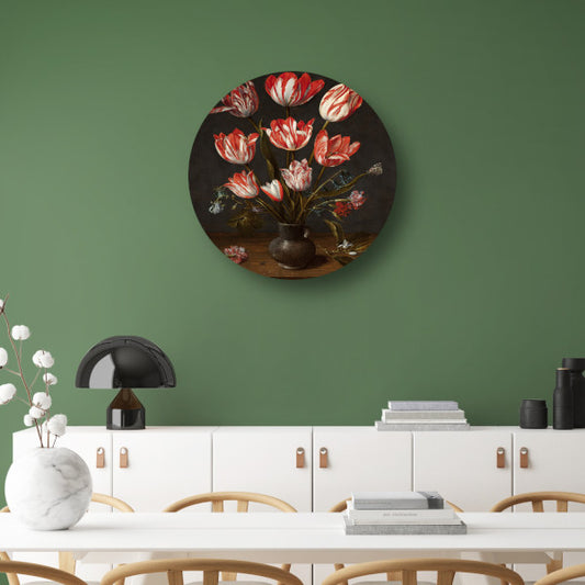 Tulpen en anjers in een aardewerken vaas - Jacob van Hulsdonck aluminium muurcirkel