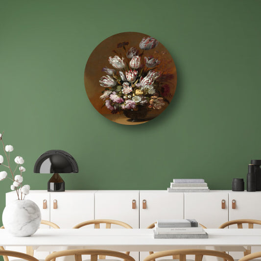 Tulpen en andere bloemen in een glazen vaas - Hans Bollongier aluminium muurcirkel