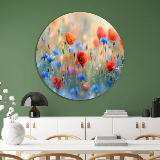Een sereen veld van bloemen in pastelkleuren aluminium muurcirkel