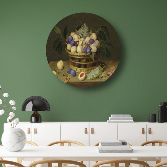 Perziken, pruimen en druiven in een rieten mand, met fruit en een vlinder op een houten tafel - Jacob van Hulsdonck aluminium muurcirkel
