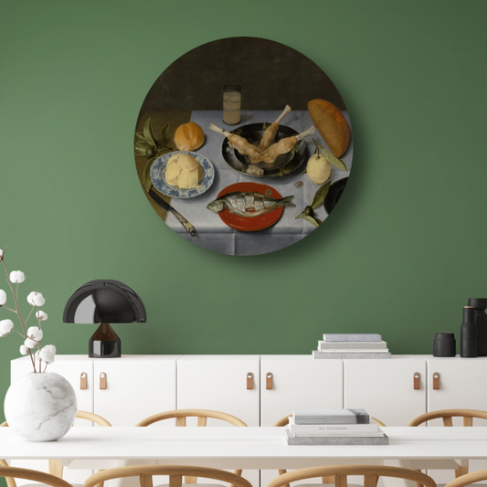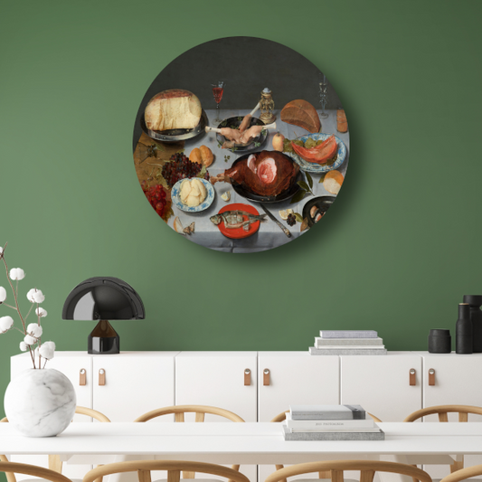 Stilleven van haring, vlees, vruchten, boter en brood - Jacob van Hulsdonck aluminium muurcirkel