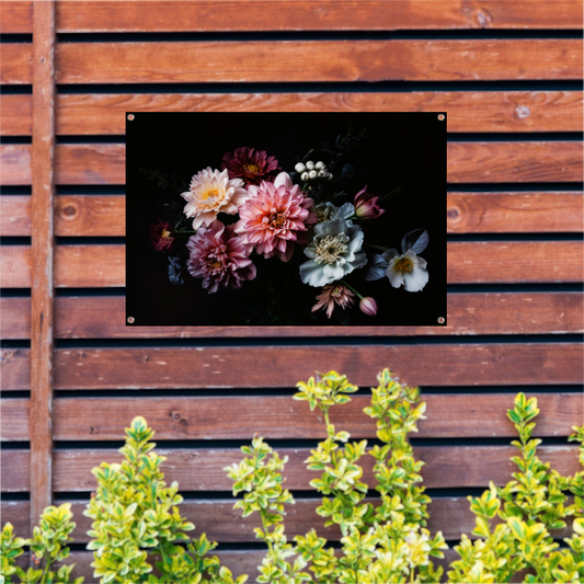 Weelderige bloemenpracht tegen donkere achtergrond tuinposter