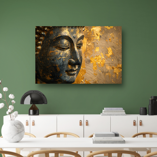 Abstracte Boeddha met serene blik en gouden bladeren poster