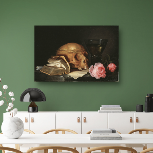 Een Vanitas-stilleven met een schedel, een boek en rozen - Jan Davidsz. de Heem canvas met baklijst
