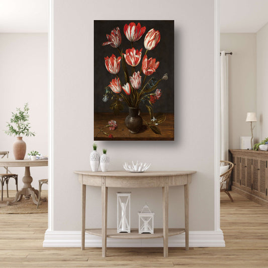 Tulpen en anjers in een aardewerken vaas - Jacob van Hulsdonck canvas met baklijst