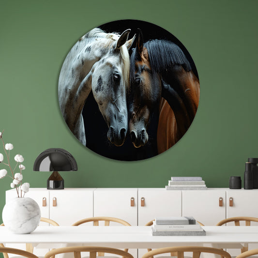Twee paarden in een donkere omgeving aluminium muurcirkel