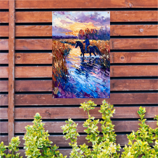 Ruiter op paard bij zonsondergang schilderij tuinposter