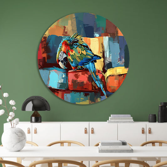 Kleurrijke papegaai op abstracte bank aluminium muurcirkel