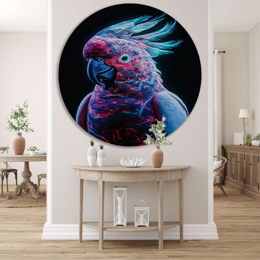 Futuristische neon papegaai in levendige kleuren aluminium muurcirkel