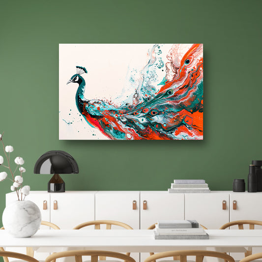 Dynamisch schilderij van een pauw in oranje poster