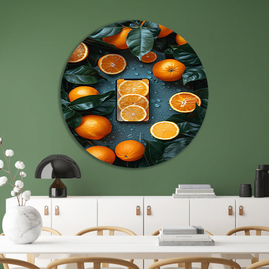 Minimalistisch stilleven met fruit en telefoon aluminium muurcirkel