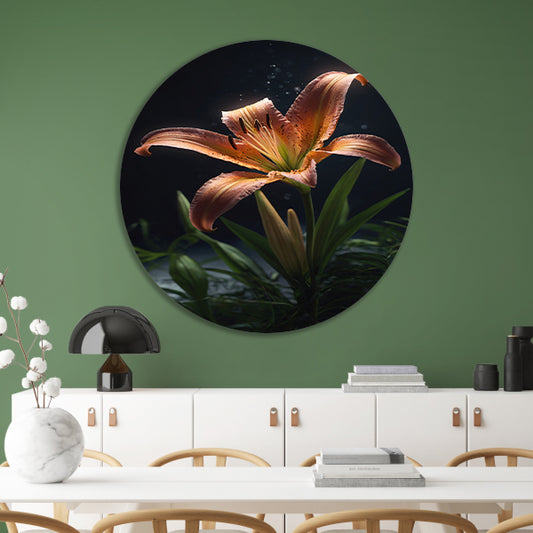 Levendige lelie met waterdruppels close-up aluminium muurcirkel