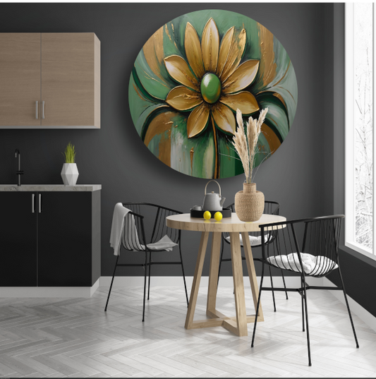 Gouden Bloem op Groene Achtergrond aluminium muurcirkel