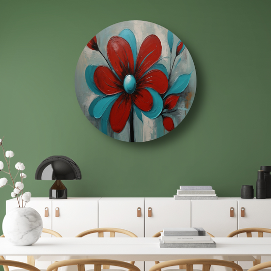 Abstracte Turquoise en Rode Bloem Kunstwerk aluminium muurcirkel