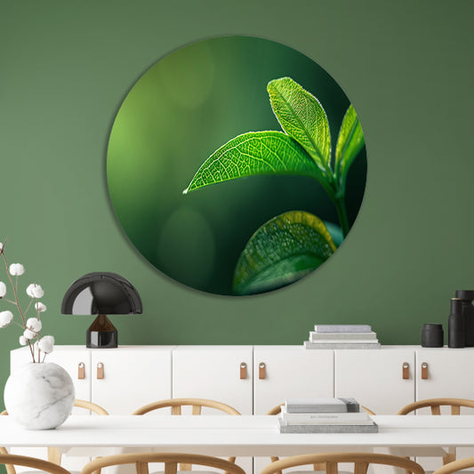 Gedetailleerde close-up van een groen blad aluminium muurcirkel