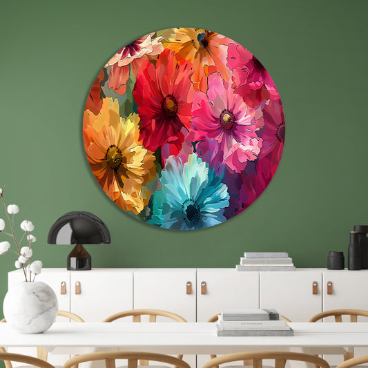 Levendige kleurenexplosie van bloemen in kunst aluminium muurcirkel