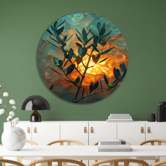 Olijftak in zonnig licht met golvende achtergrond aluminium muurcirkel