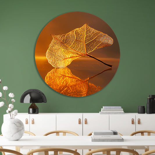 Blad perfect weerspiegeld in gouden licht aluminium muurcirkel