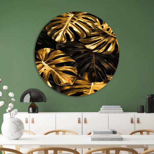 Luxe Gouden Monstera Bladeren op Zwart aluminium muurcirkel