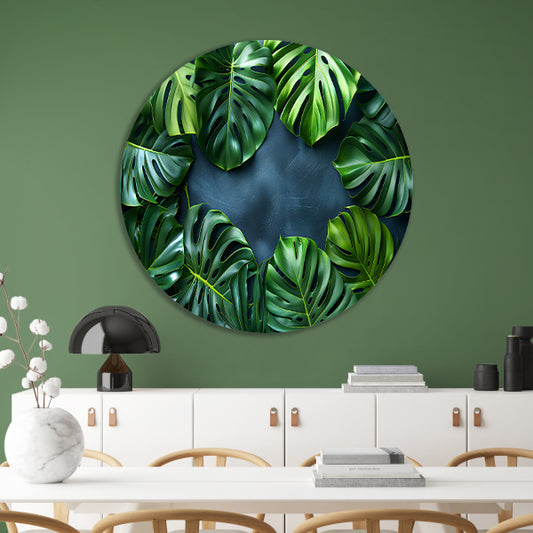Monstera Bladeren op Blauwe Achtergrond aluminium muurcirkel