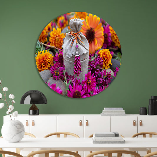 Paarse bloemen met tas aluminium muurcirkel