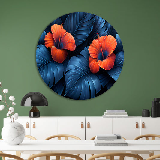 Rode Hibiscusbloemen met Blauwe Bladeren aluminium muurcirkel