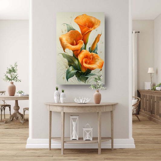 Oranje calla lelies met elegante groene bladeren canvas met baklijst
