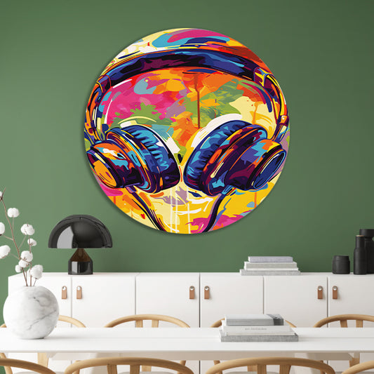 Kleurrijke Koptelefoon in Verfspatten aluminium muurcirkel