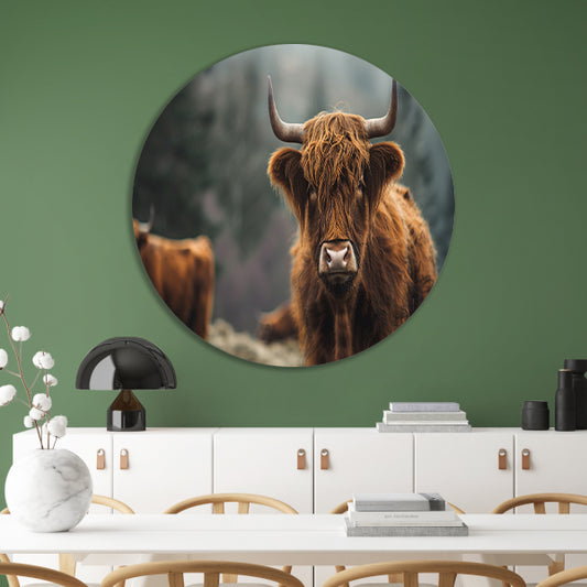 Schotse Hooglander in mistig boslandschap forex muurcirkel
