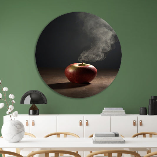 Rode appel en stijgende rook op tafel aluminium muurcirkel