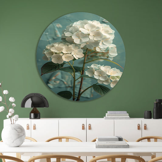 Witte Hortensia Bloemen in Turquoise Vaas forex muurcirkel