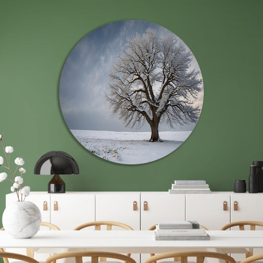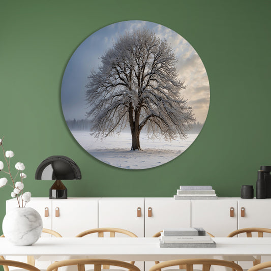 Winterboom in besneeuwd landschap bij zonsondergang forex muurcirkel