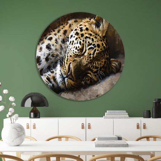 Gedetailleerde schilderij van slapende luipaard aluminium muurcirkel