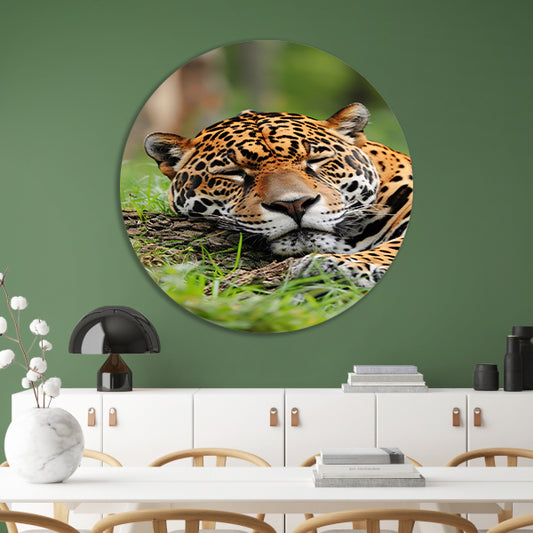Slapende jaguar op gras schilderij aluminium muurcirkel