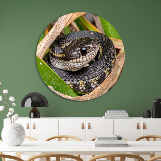 Slang verscholen tussen groene bladeren aluminium muurcirkel