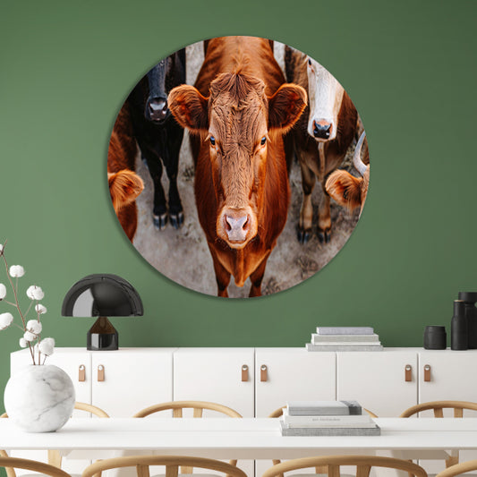 Koeien met intense blik op het platteland aluminium muurcirkel