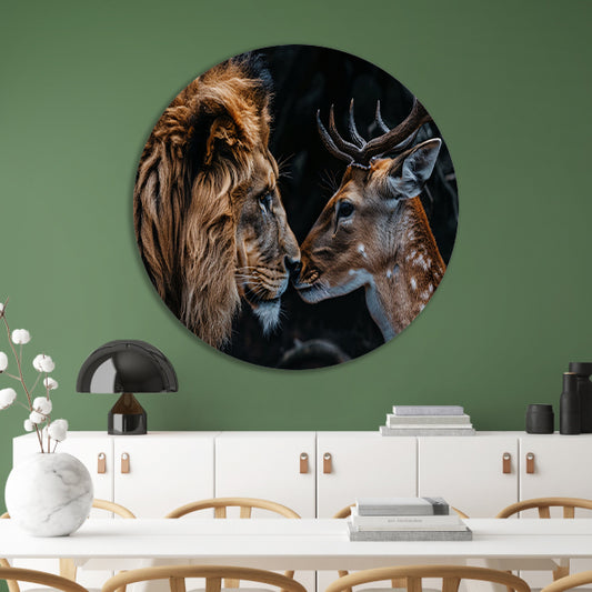 Leeuw en hert in een donker bos forex muurcirkel
